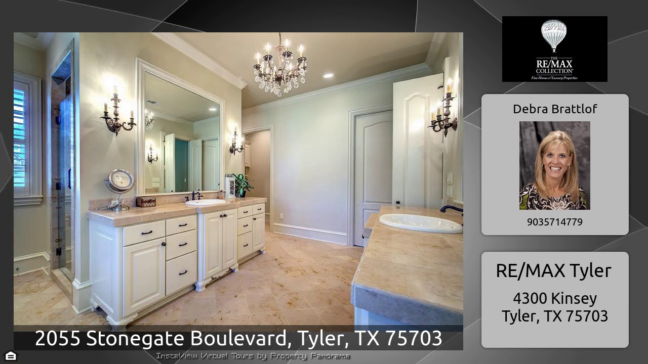 The Virtual Tour for the property at 2055 Stonegate Boulevard, Tyler, TX 75703 listed for $949,995: Other homes for sale by Debra Brattlof of RE/MAX Tyler: French Estate situated on 1.15 acres in gated Stonegate addition. Hand scraped hardwoods in entry, living, dining and master BR with serene views. Gourmet kitchen offers dbl ovens, warming drawer, ice machine, gas range, butlers pantry, instant hot water tap, built-in refrigerator-freezer and custom tile. Home has 3 BR each with private on-suite bathrooms, 2 half baths, large media room, screened back porch with stained beadboard ceiling …