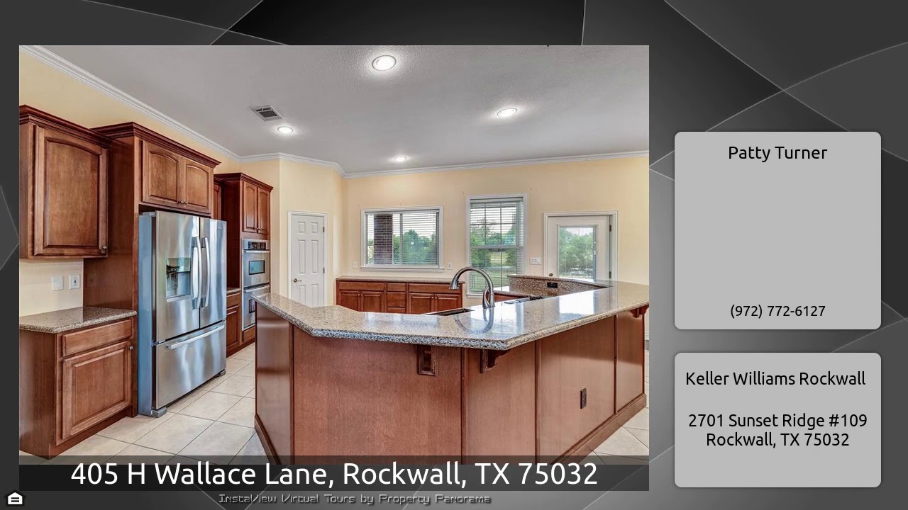 The Virtual Tour for the property at 405 H Wallace Lane, Rockwall, TX 75032 listed for $565,000: Other homes for sale by Patty Turner of Keller Williams Rockwall: Custom home perfectly situated on 2 acres with pond & no HOA in Rockwall! Wonderful drive up with pipe fence & brick entry. Enjoy coffee beneath large covered porch. Spacious family room opens to kitchen offering granite counters, ss appl incl double ovens, & ample cabinet & prep space, plus two walk-in pantries. French doors lead to large dining room. Versatile study or workout room. Master suite offers bath with soaking tub, …