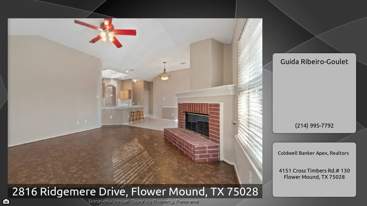 The Virtual Tour for the property at 2816 Ridgemere Drive, Flower Mound, TX 75028 listed for $329,900: Other homes for sale by Guida Ribeiro-Goulet of Coldwell Banker Apex, Realtors: LOVELY 1-ONE STORY HOME WITH CREEK LOT AND MANY UPDATES. 3 bed, 2 bath, 2 living, 2 dining and a great open concept for entertaining. Kitchen updated with granite counters, custom backsplash & black appliances. Family room with a brick corner fireplace. Breakfast nook with french doors to the deck and yard. Master suite features a window seat, large walk-in closet, dual sinks, separate shower and soaking tub. …