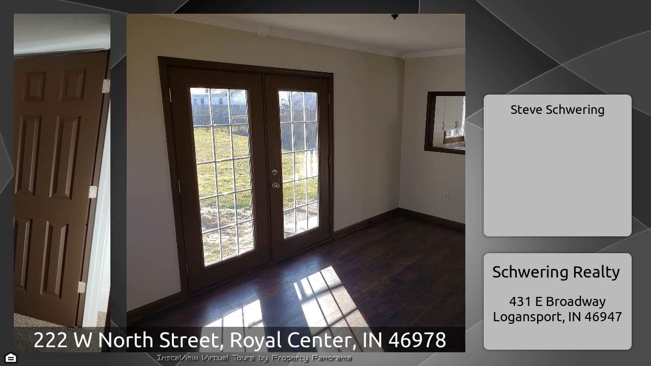 The Virtual Tour for the property at 222 W North Street, Royal Center, IN 46978 listed for $105,000: Other homes for sale by Steve Schwering of Schwering Realty: Nice big Home. 5 bedrooms. Completely remodeled. Brand new roof. New furnace. New gutters and downspouts. French doors into a large master bedroom. Large master bathroom with vaulted ceiling. All new kitchen and appliances. French doors leading into the back yard off of the spacious dining room. Pantry. Fenced in back yard.
