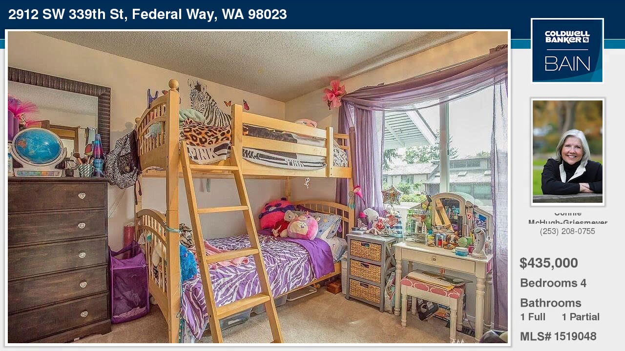 2912 SW 339th St Federal Way Washington Homes for Sale | www.coldwellbankerbain.com | Connie McHugh-Griesmeyer with Coldwell Banker Bain | See full property details at | This Mid Entry 4BD 2BA Beauty embraces a natural coastal feel w/large greeting porch. Spacious rooms w/vaulted living room ceiling & formal dining lead to elegant gourmet kitchen. Den has wet bar. Master suite overlooks landscaped yard. Grand Entertaining deck is accessed by French doors & has hot tub in private setting. Lower level enjoys 2nd fireplace, large bedroom & French doors to patio. Oversized 2 car garage has ample room. New windows come with beautiful blinds. Super Great Location.