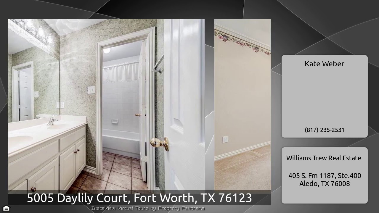 The Virtual Tour for the property at 5005 Daylily Court, Fort Worth, TX 76123 listed for $334,900: Other homes for sale by Kate Weber of Williams Trew Real Estate: Adorable, meticulously maintained one-owner home in Fort Worth's Hulen Heights! Entry welcomes you into large foyer with tall ceilings, private study with french doors, & oversized formal dining area. Open floor plan includes beautiful eat-in kitchen overlooking living area with custom built-ins & fireplace. Master suite boasts oversized bedroom with seating area & bay windows, jetted bathtub, separate shower, & huge walk in …