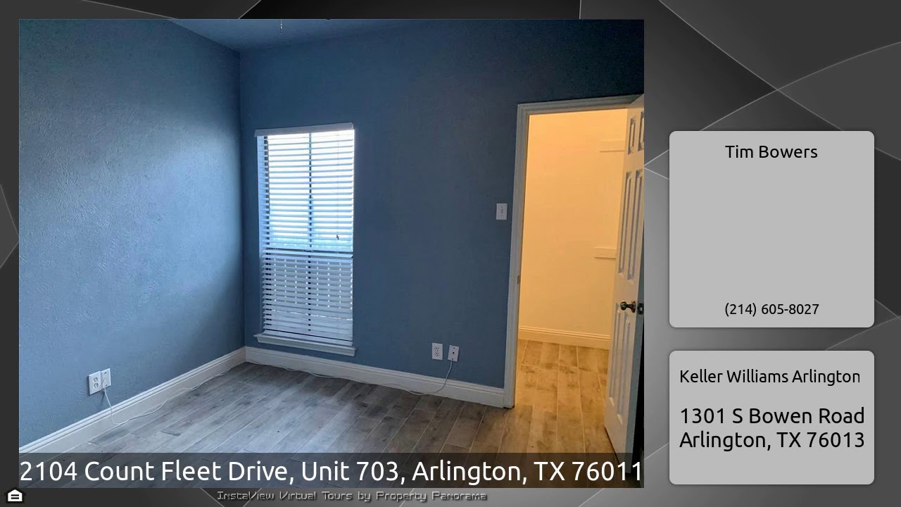 The Virtual Tour for the property at 2104 Count Fleet Drive, Unit 703, Arlington, TX 76011 listed for $1,100: Other homes for sale by Tim Bowers of Keller Williams Arlington: Striking 2 bedrooms! Open kitchen boasts an abundance of rich cabinetry, oversized island w storage and eat-in bar, newly installed granite countertops, brushed nickel fixtures, Stainless Steel Whirlpool Appliances, Fridge & WD to stay! Gorgeous porcelain wood look floors grace this home. Corner fireplace opens to living & nook-dining-flex space. French door leads to cozy covered patio w storage. Bath offers two …