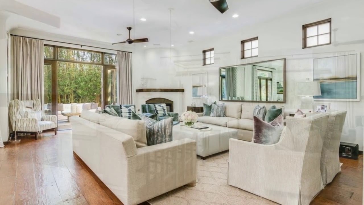 custom wrought iron, and designer lighting. A handsome corner fireplace is the focal point of this inviting room. Step into the open kitchen to discover coastal chic styling and an expansive center island. Envision your next affair hosted in the magnificent dining room. You’ll find 5 bedrooms,