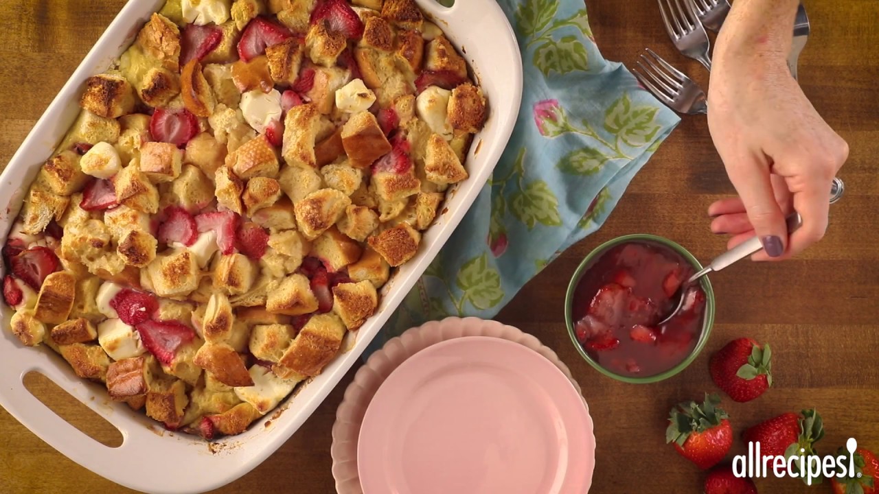 Whether you’re celebrating a special Mother’s Day or entertaining during a holiday brunch, this indulgent recipe transforms French toast into something deliciously memorable. A custard of half-and-half, eggs and maple syrup is poured over cubed white bread and cream cheese and sliced fresh strawberries. When this breakfast casserole bakes up puffy and golden, dowse with homemade strawberry sauce for the ultimate yum.