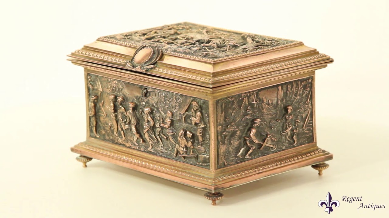 The lid features truly remarkable cast bronze scenes of hunters, dogs and preys in the forest. The four lateral panels have equally attractive cast bronze panels featuring dancing figures in a village, farmers at work and people enjoying a taste of wine in company, making this box an outstanding luxury piece of folklore art.