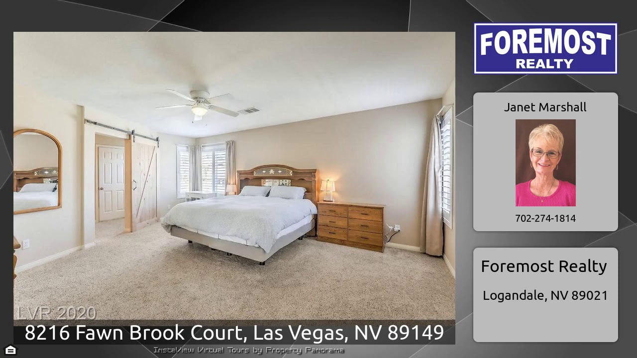 The Virtual Tour for the property at 8216 Fawn Brook Court, Las Vegas, NV 89149 listed for $469,900: Other homes for sale by Janet Marshall of Foremost Realty: 2-Story Home in desirable Timberlake community! French doors to remodeled backyard, synthetic grass, lap pool & spa w/safety fence. Oversized patio cover, dog run, RV gate, concrete on side to park your toys! Plantation shutters for natural light! Open kitchen w/granite counters, SS appliances. Formal dining & Liv rm – great for entertaining. New wood laminate & carpet. Upstairs has loft, office & 4 bds. Spacious Mstr bd/bath. COME & SEE!