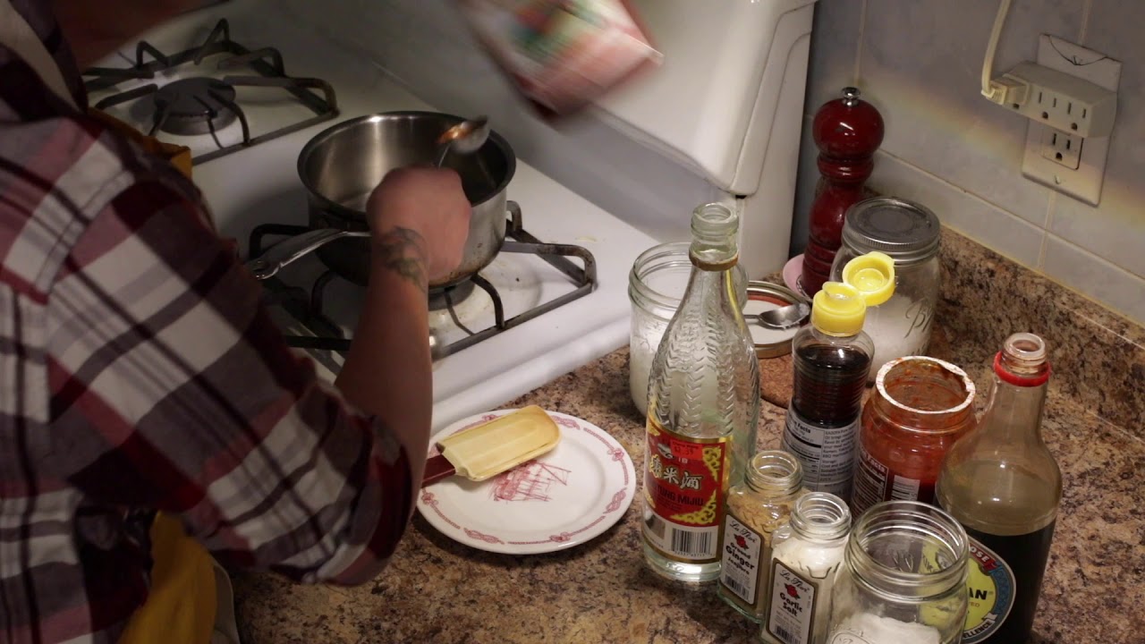3. For the sauce. Heat up garlic and oil until frgrant, deglaze with cooking wine. Turn off heat and add the rest of the ingredients. Bring back to flame until sauce is well mixed. Put aside.