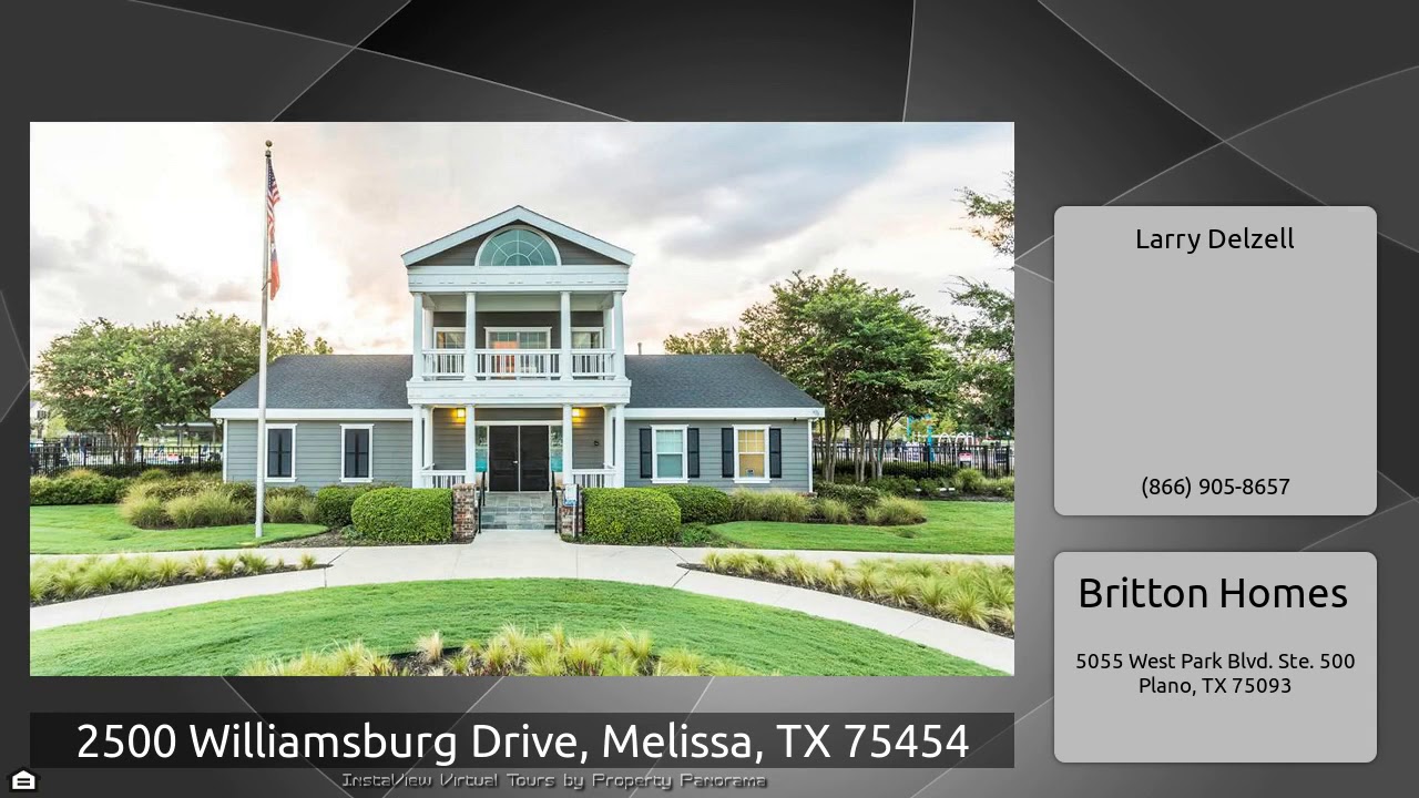 The Virtual Tour for the property at 2500 Williamsburg Drive, Melissa, TX 75454 listed for $459,900: Other homes for sale by Larry Delzell of Britton Homes: PERRY HOMES NEW CONSTRUCTION! Located on a corner homesite. Library with French doors frames the 19-foot entry way. Formal dining room with ceramic tile floor. Two-story family room with ceramic tile floor features a wall of windows. Kitchen features an island with a built-in seating space. Butler's pantry and a large walk-in pantry. Master bedroom with a curved wall of windows. Master bathroom with dual sinks, corner garden tub, …