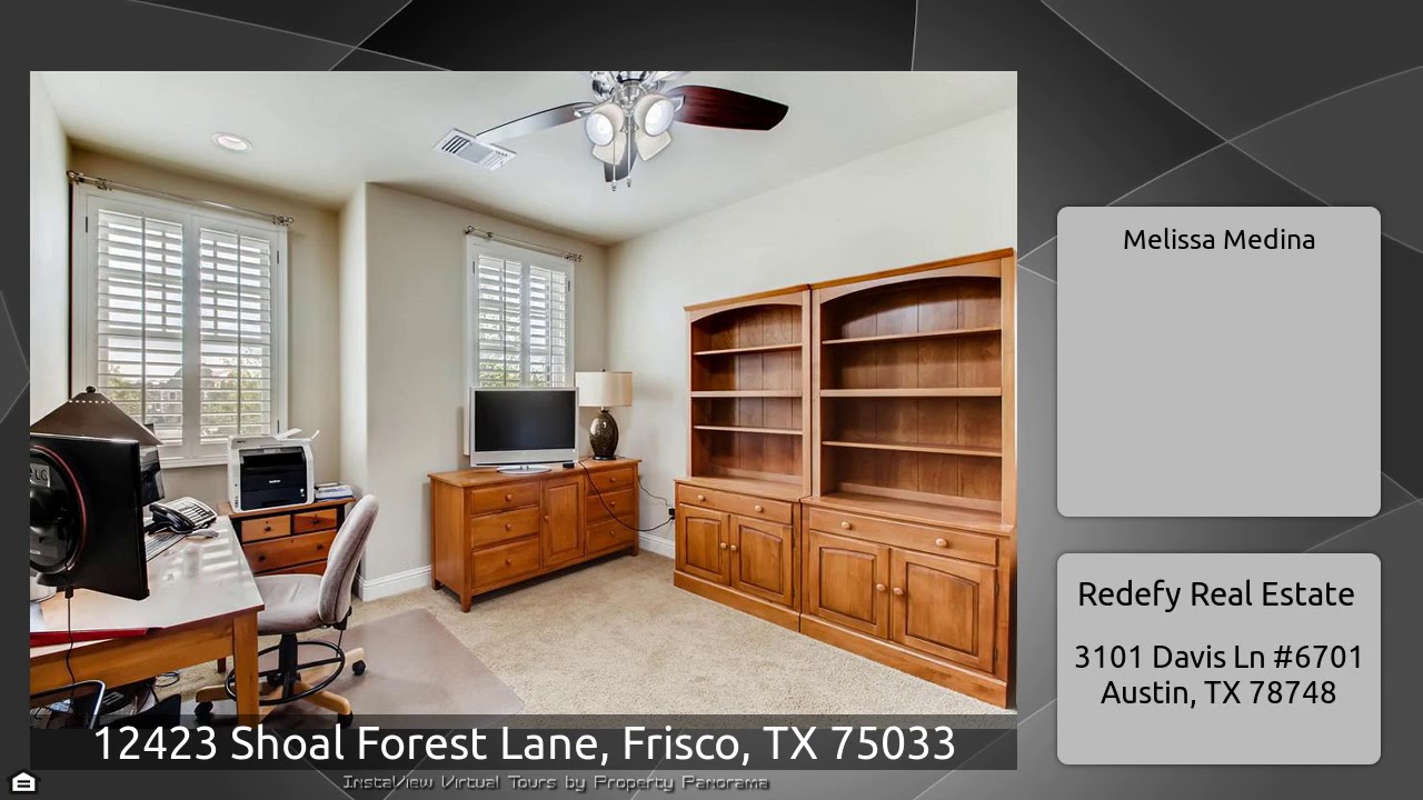 The Virtual Tour for the property at 12423 Shoal Forest Lane, Frisco, TX 75033 listed for $789,900: Other homes for sale by Melissa Medina of Redefy Real Estate: Home across The Plaza Comm Center – Painted brick, shutters, front porch w fans. Paneled study and french doors from the porch that lead to the elevator up to the second floor media room. Two bedrooms with walk in closets, full bath, computer niche and storage complete the second floor. Study, Dining & Breakfast room, Family room with cast stone FP, & custom kitchen with viking professional grade appliances with 10.5 foot ceilings …