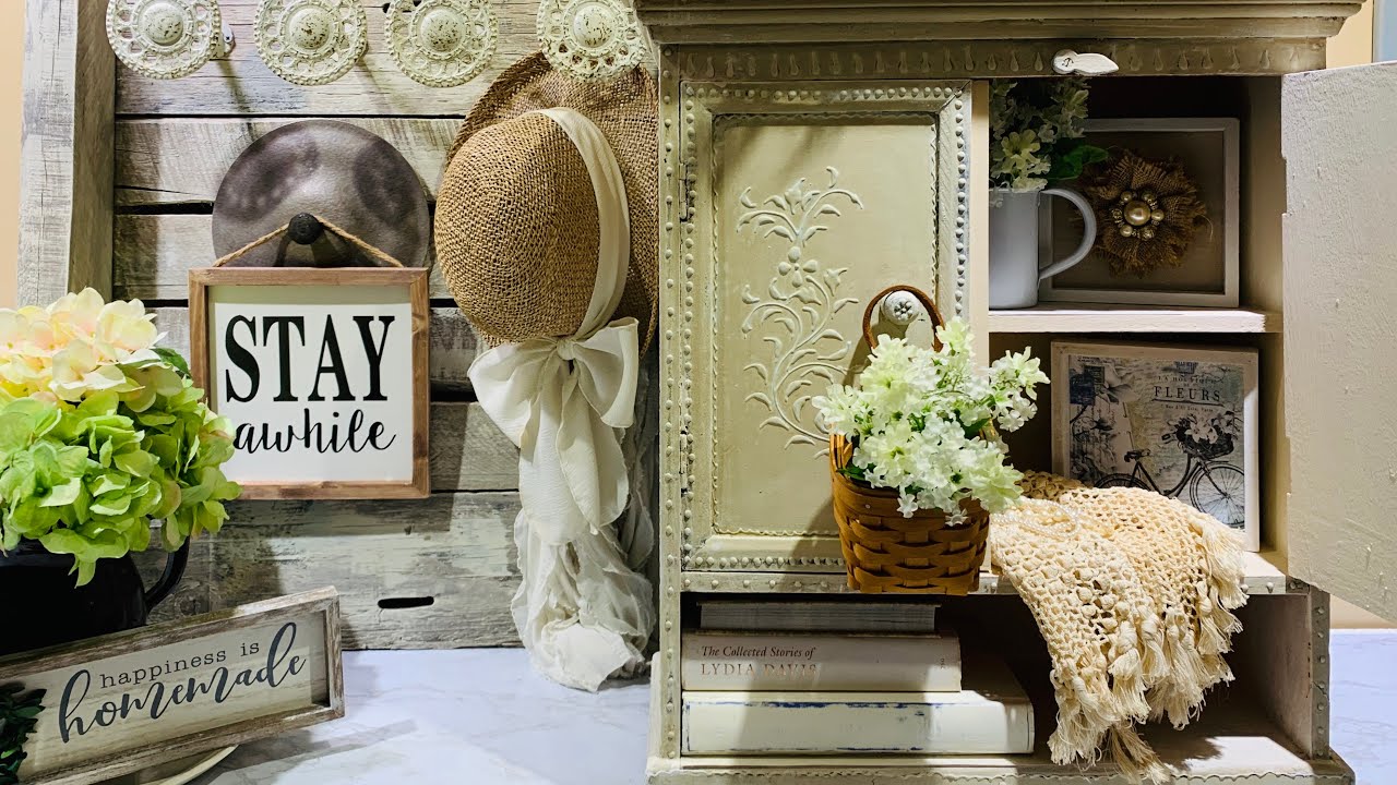 I take several items and show how you can apply paint, wire hangers and printable images to things you may already have around your home to create beautiful French country farmhouse decor pieces. In the first project, I up cycle and transform a cabinet that I purchased from a local vendor and create a more neutral and complimentary piece for my home. I used several different colors of paint (Waverly white and cashew) and then I distress the piece using a damp cloth and fine sanding block. I created the look I wanted and then I painted the interior using Folk Art Vintage White craft paint and showed how you can decorate the interior even more using scrapbook paper. I stage the cabinet and then demonstrate how you can take ornate wall shelves to add another distinctive feature and accent to the cabinet or other settings in your home. I show how you can transform pan and pot lids into unique wall racks and hangers to add a more rustic flare to any space. I show how you can turn a tree branch into a decorative wall hanger and stage with various items to show many ideas for this cute and resourceful piece. I had 3 Dollar Tree frames in my stash and I tell how to print out free printables of your choice, cut them down to size and insert into the frames to create beautiful and unique pieces of artwork to your displays. I use one frame to show how you can cover the backing with fabric and attach a burlap rosette with a vintage piece of jewelry (earring) to make another stylish but very inexpensive decorative piece. I stage all of the up cycled and transformed pieces to show how they can compliment any space and areas throughout your home.