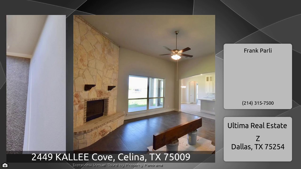 The Virtual Tour for the property at 2449 KALLEE Cove, Celina, TX 75009 listed for $459,000: Other homes for sale by Frank Parli of Ultima Real Estate: $20K PRICE DROP!!Brand New ONE STORY on 1 acre in Celina! No city taxes!Beautiful brick and stone combination. Fantastic layout features HUGE Formal Dining with Panned ceiling, large Study with French Doors, HUGE Family Room with 12' ceiling, 20' x 14' Master Bedroom with 12' ceiling and HUGE closet, great Kitchen with Custom Cabinets and granite tops, 3 large bedrooms, and HUGE 18' x 18' Game Room! Hardwood floors in Entry, Study, F.Dining, …
