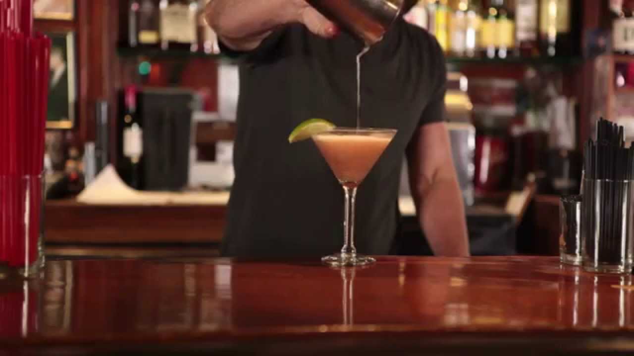 And we’re gonna shake this up really good. Swirl out our icy water. Got a nice frosted glass there and I’m gonna garnish it with lime today. And then we’re just gonna strain our drink into it. And that’s your french martini.