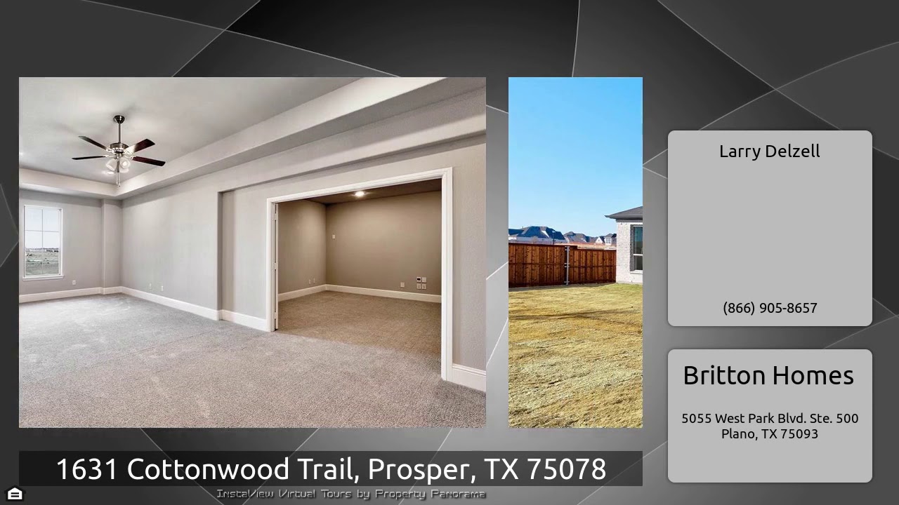 The Virtual Tour for the property at 1631 Cottonwood Trail, Prosper, TX 75078 listed for $749,900: Other homes for sale by Larry Delzell of Britton Homes: BRITTON HOMES NEW CONSTRUCTION READY FOR MOVE-IN! Entry welcomes with 20-foot ceiling. Hardwood floors through out. Library with French doors. First floor private guest suite. Formal dining. Hardwood staircase. Family room with cast stone fireplace. Kitchen features double ovens, gas range, lots of counter space, large island with built-in seating space, pantry and butler's pantry. Secluded master suite with a wall of windows. Double door …