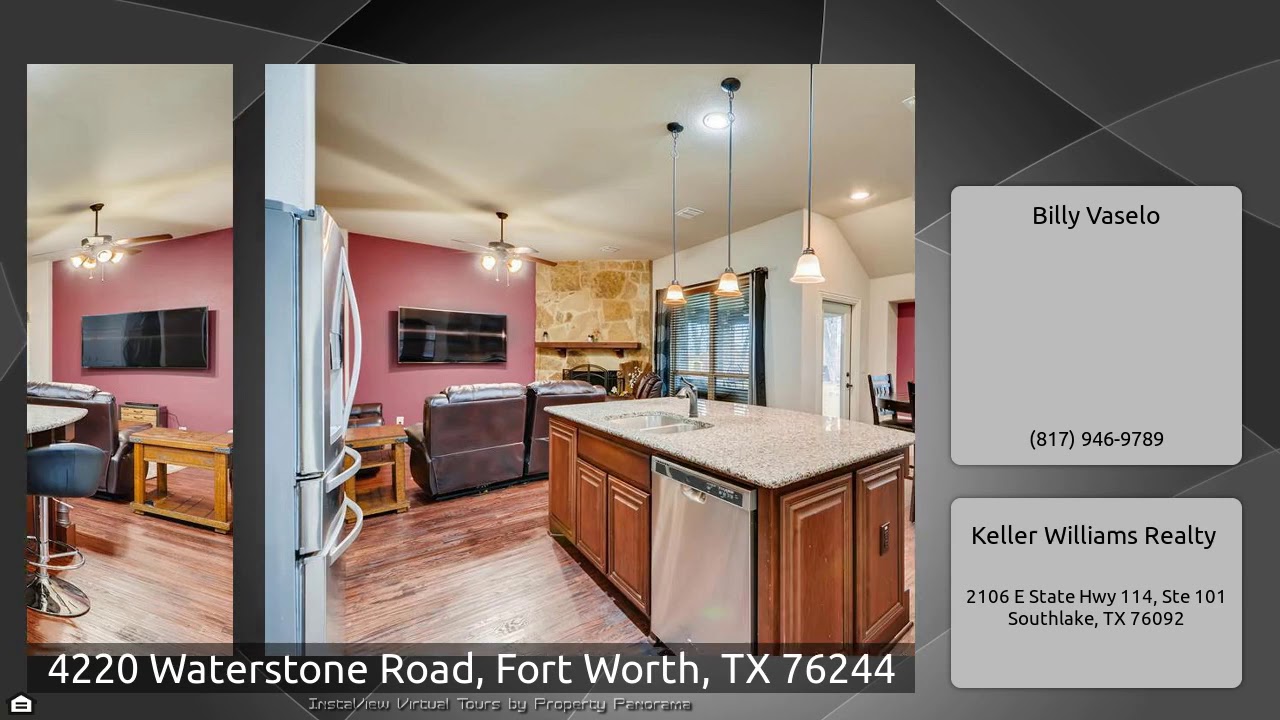 The Virtual Tour for the property at 4220 Waterstone Road, Fort Worth, TX 76244 listed for $425,000: Other homes for sale by Billy Vaselo of Keller Williams Realty: Beautiful home in Desirable Keller ISD*Great landscaping in front of home*13,504 sq ft lot! Beautiful walkway to front door*Large entry way*Wood Floors*Office with French doors*Large formal dining room*Kitchen has granite countertops*Stainless steel appliances*Island*Lots of cabinet space*large pantry closet*Breakfast nook with bay windows and extra cabinets and counter space*High end upgrades in Master bath&lighting*walk in …