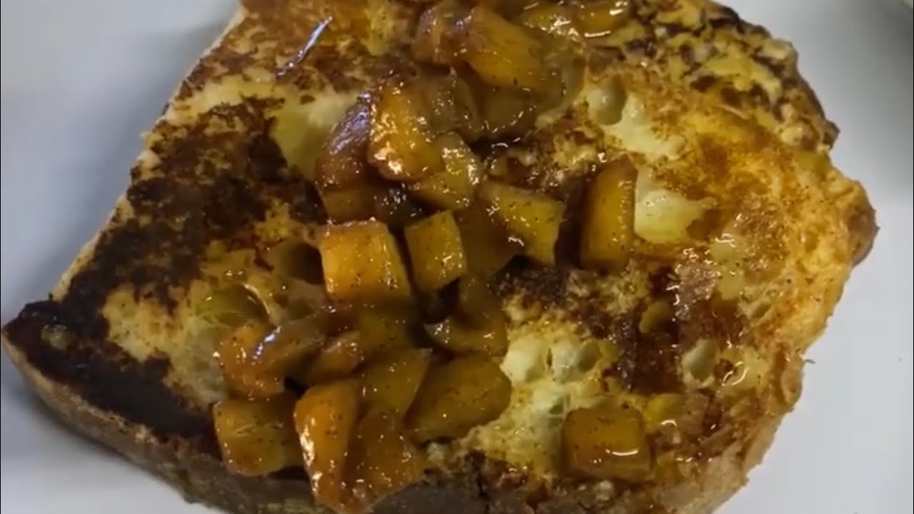 Layer french toast plate and scoop apples over it. Drizzle maple syrup over the top before serving.