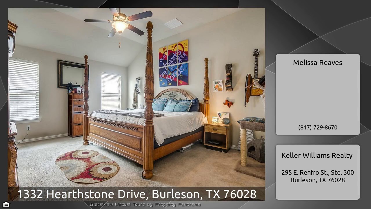 The Virtual Tour for the property at 1332 Hearthstone Drive, Burleson, TX 76028 listed for $232,000: Other homes for sale by Melissa Reaves of Keller Williams Realty: Beautiful brick home, 4 bedrooms plus an office with split bedrooms & open layout. Upon entering notice tile flooring, crown molding & french doors leading into office. Formal dining room is spacious & rounded corners & arched door ways lead to the breakfast area. Kitchen features abundance of storage cabinets, granite counters with tile backsplash, stainless steel appliances include double oven, built in microwave, dishwasher …