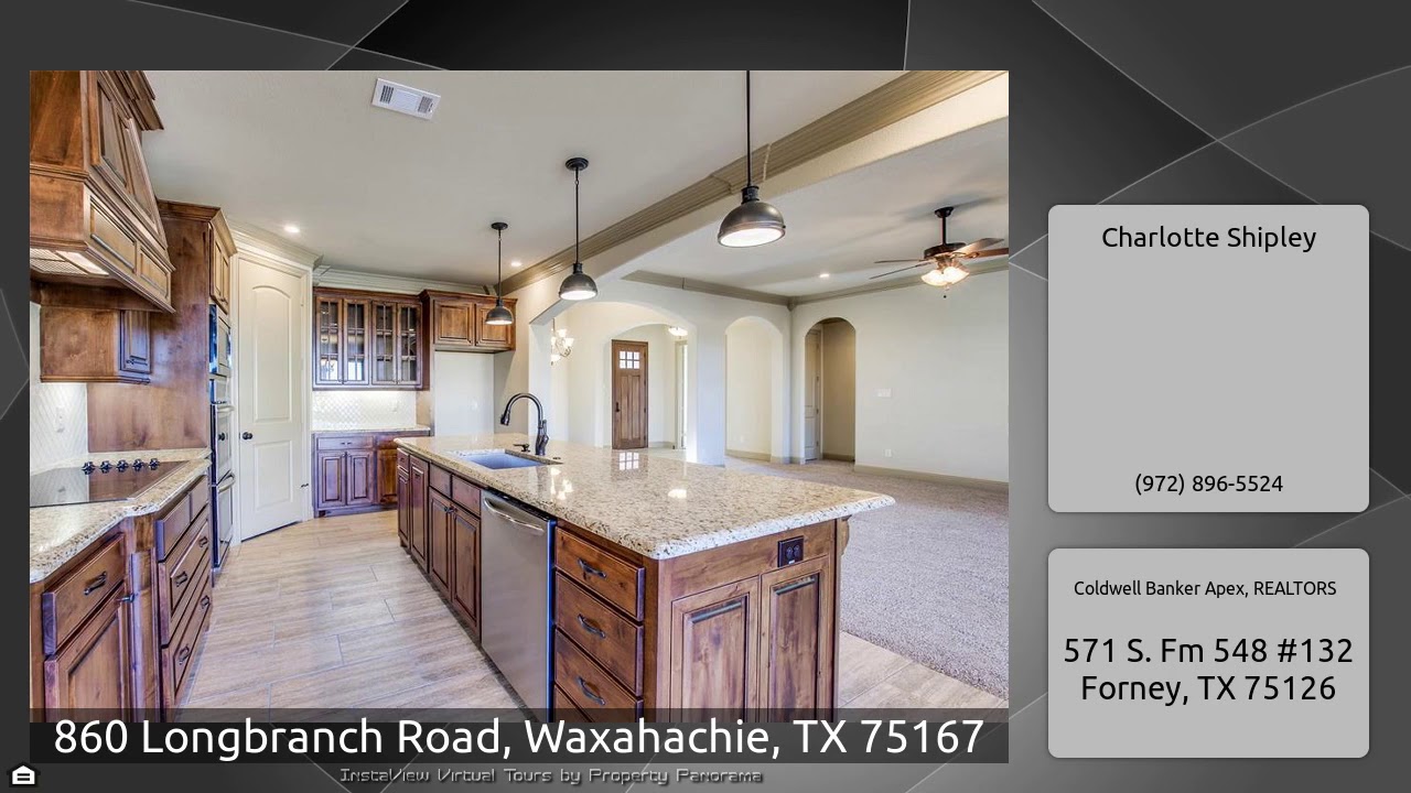The Virtual Tour for the property at 860 Longbranch Road, Waxahachie, TX 75167 listed for $434,900: Other homes for sale by Charlotte Shipley of Coldwell Banker Apex, REALTORS: Majestic design by NEXXUS Custom Homes! 1.178 acre lot has landscaping and sprinkler system! Elegant formal dining room with hardwood flooring, handsome study with French doors! Kitchen features beautiful granite with large island peninsula and pendant lighting! Other amenities include knotty alder cabinetry, built-in SS appliances and double ovens! Corner pantry with pantry door storage rack! Private master retreat …