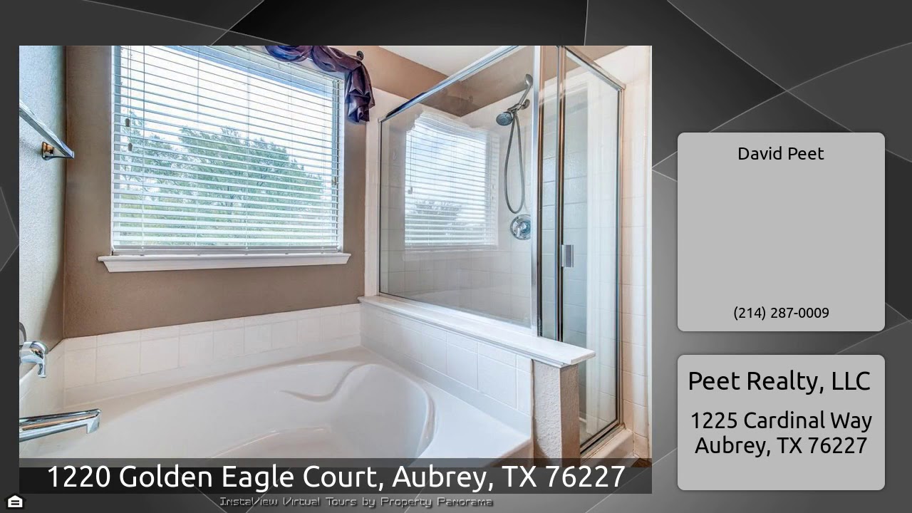 The Virtual Tour for the property at 1220 Golden Eagle Court, Aubrey, TX 76227 listed for $274,900: Other homes for sale by David Peet of Peet Realty, LLC: Two-story, gorgeous home in Paloma Creek with community pools & parks. 4 bed & 2.5 baths. This home boasts… french doors leading into the front office, formal dining room, two living room spaces with fresh paint. Fully updated Stainless Steel kitchen appliances. The family room is warmed by a corner fireplace & enjoys backyard views. 1st floor Study. 2nd floor features Game or Media Room with surround-sound, large Master Suite & …