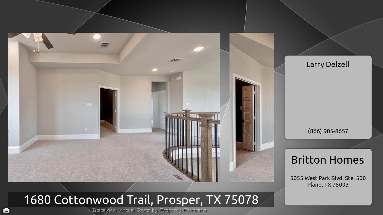 The Virtual Tour for the property at 1680 Cottonwood Trail, Prosper, TX 75078 listed for $749,900: Other homes for sale by Larry Delzell of Britton Homes: BRITTON HOMES NEW CONSTRUCTION READY FOR MOVE-IN! Study with French doors welcomes with 20 foot ceilings at entry. Hardwood floors throughout first floor. Formal dining room. Family room with a corner fireplace and sliding glass doors. Kitchen features a large island with built-in seating space, walk-in pantry, butler's pantry, double ovens and cooktop. Morning area with a curved wall of windows. First floor guest suite. Private master …