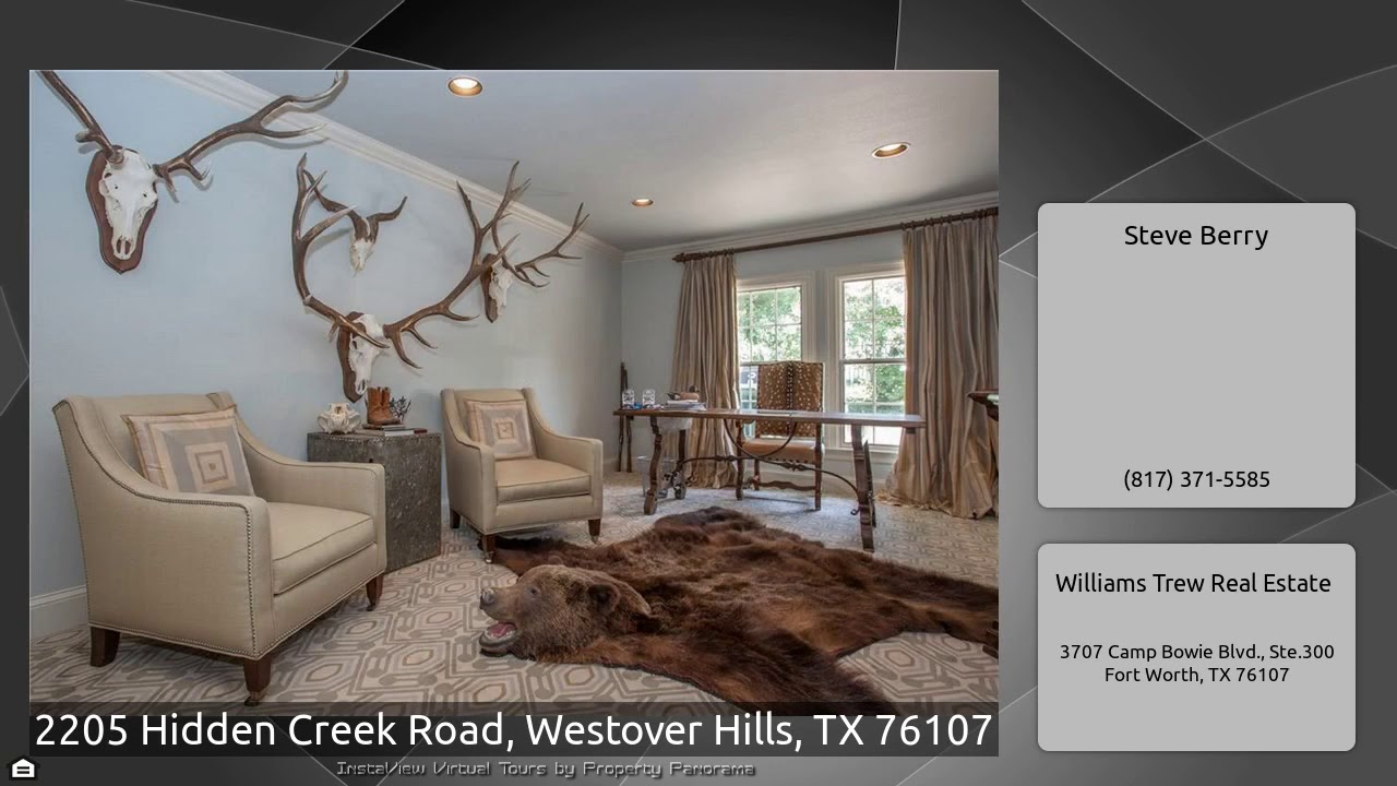 The Virtual Tour for the property at 2205 Hidden Creek Road, Westover Hills, TX 76107 listed for $1,790,000: Other homes for sale by Steve Berry of Williams Trew Real Estate: Situated on a hillside in the heart of Westover Hills. Meticulously landscaped with pool, covered patio and great yard for entertaining. This lovely traditional style home has gracious entry with French limestone floors, separate living and dining room. Family room opening into kitchen and breakfast area overlooking back yard. Master downstairs with beautiful bath, nice size closets and storage. Guest bedroom down …