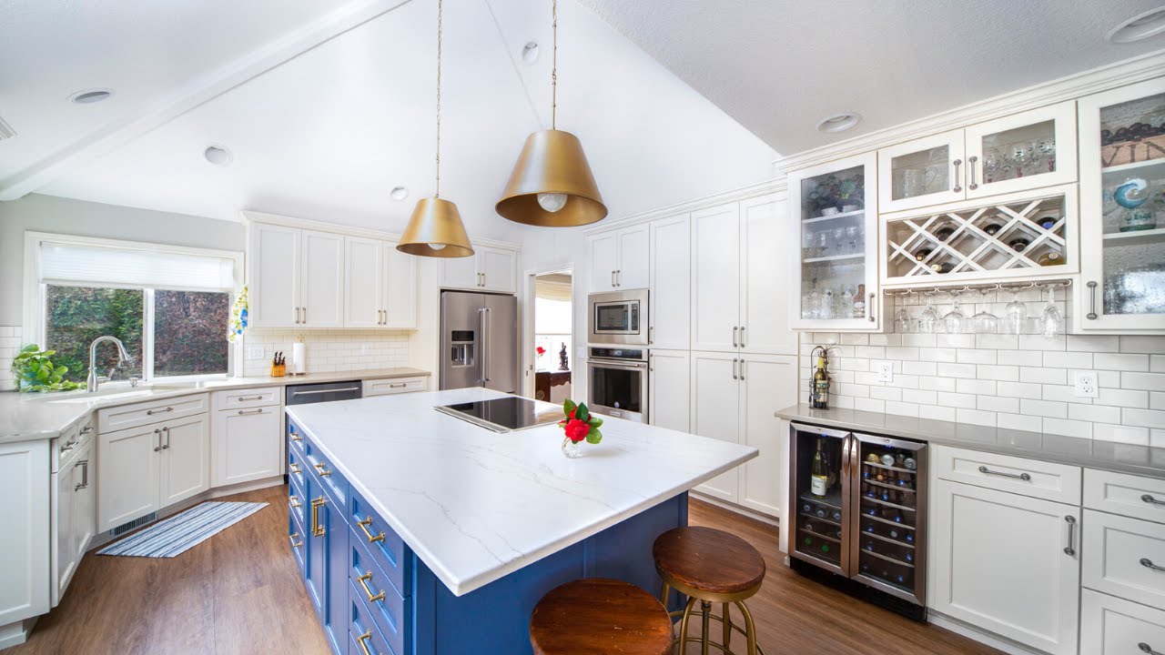 The two tone quartz, Basix Portabello on the outer counter tops and Polarstone Pietra Danae on the island, along with the sleek Blanco Biscotti undermount sink add form and function. Being able to wipe the counter tops directly into the sink is a joy everyone should experience. We added a custom wine bar and the Navy Blue statement island to make this kitchen really stand out. The result was very happy clients who love spending time in their home.