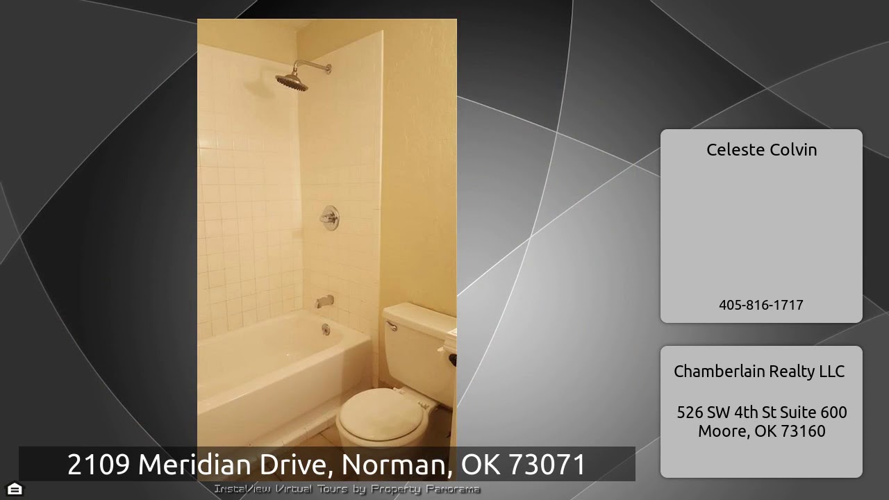 The Virtual Tour for the property at 2109 Meridian Drive, Norman, OK 73071 listed for $1,050: Other homes for sale by Celeste Colvin of Chamberlain Realty LLC: This home is a must see! Enjoy a wonderful floor plan with an very large living area that includes a fireplace. Living space opens directly to dining room. Layout is great for entertaining where your BBQ can be right outside the modern French doors. Large kitchen with lots of counter space and storage. Fridge stays. Secondary bedrooms are nicely-sized with large closets and ceiling fans. Hall linen closet offers lots of shelving and …