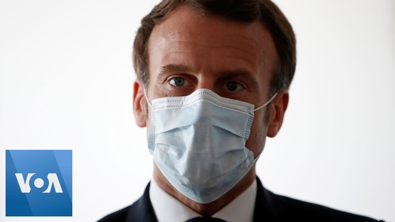 French President Emmanuel Macron, wearing a protective face mask, talks with health workers as he visits a medical center in Pantin, near Paris, as the spread of COVID-19 continues in France, Tuesday, April 7.