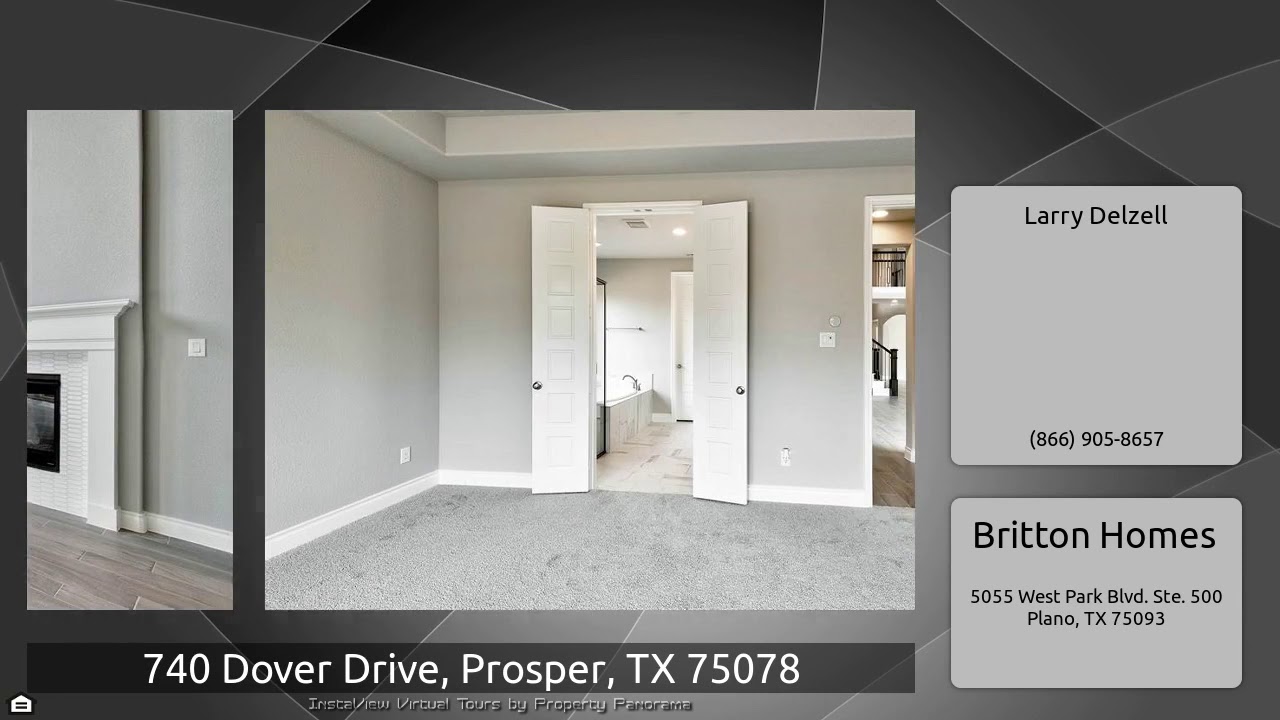 The Virtual Tour for the property at 740 Dover Drive, Prosper, TX 75078 listed for $474,900: Other homes for sale by Larry Delzell of Britton Homes: PERRY HOMES NEW CONSTRUCTION READY FOR MOVE-IN! Front porch leads into a 19-foot entry. Library with French doors and formal dining room frame the extended entry. Kitchen features a curved island with a walk-in pantry. Two-story family room with a wall of windows and cast stone fireplace. Large covered patio off the family room. Master bedroom with a wall of windows. Master bath features dual vanities, garden tub, a separate glass enclosed …