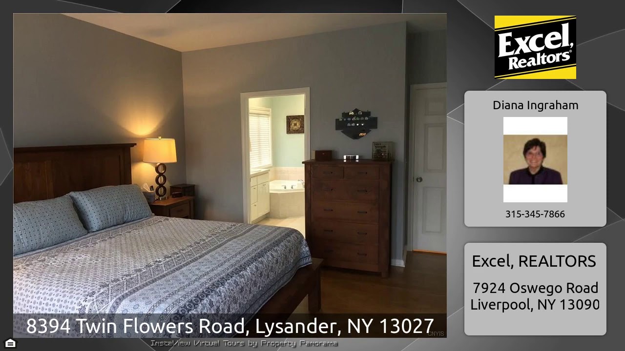 The Virtual Tour for the property at 8394 Twin Flowers Road, Lysander, NY 13027 listed for $399,900: Other homes for sale by Diana Ingraham of Excel, REALTORS: Rare Radisson Alberici ranch! Brick, cedar, custom trim, stone landscaping with LED lighting, private fenced yard. 2,100SF! Impeccably cared for one level open design. Hardwoods throughout (except craft room/dining room carpeted w/ French doors,) great rm w/ gas fireplace & tray ceiling, kitchen w/ expansive granite breakfast bar/island for casual dining, stainless double ovens & new side by side fridge, new microwave, morning rm w/ …