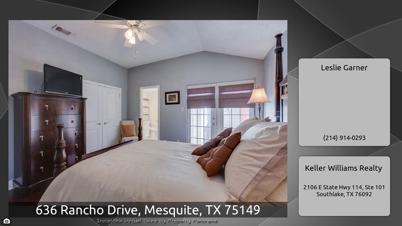The Virtual Tour for the property at 636 Rancho Drive, Mesquite, TX 75149 listed for $165,000: Other homes for sale by Leslie Garner of Keller Williams Realty: This charming little gem will not last long. From the entry you will notice the beautiful engineered hardwood floors. There is a fireplace in the living room with gas logs. French doors in the dining area open to a covered back patio. The kitchen includes gas cooking, corner sink and pantry. Off of the living room is a bedroom with doors that could be an office. The master has a private back patio and two closets, the larger with …
