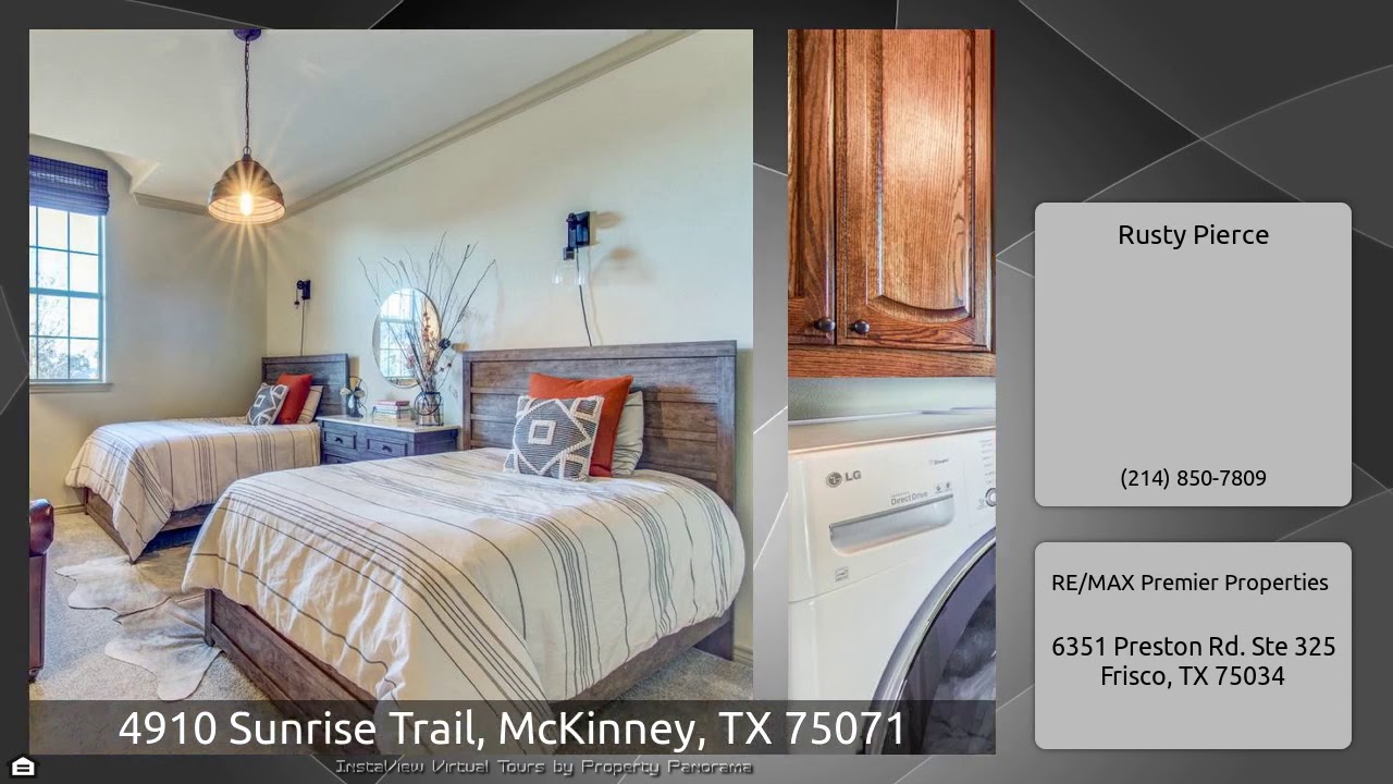 The Virtual Tour for the property at 4910 Sunrise Trail, McKinney, TX 75071 listed for $695,000: Other homes for sale by Rusty Pierce of RE/MAX Premier Properties: Home is Vacant! Phenomenal property with pierred slab, roof 2016, storm shelter, & generator in prestigious gated community on 1 acre lot with balcony overlooking the beautiful mature trees. Gorgeous hardwood floors flow from entry to dining room, living room & study with coffered ceiling, french doors and built-ins. Striking kitchen features granite counters, gas cook-top, island & breakfast bar. Inviting living room has stone …