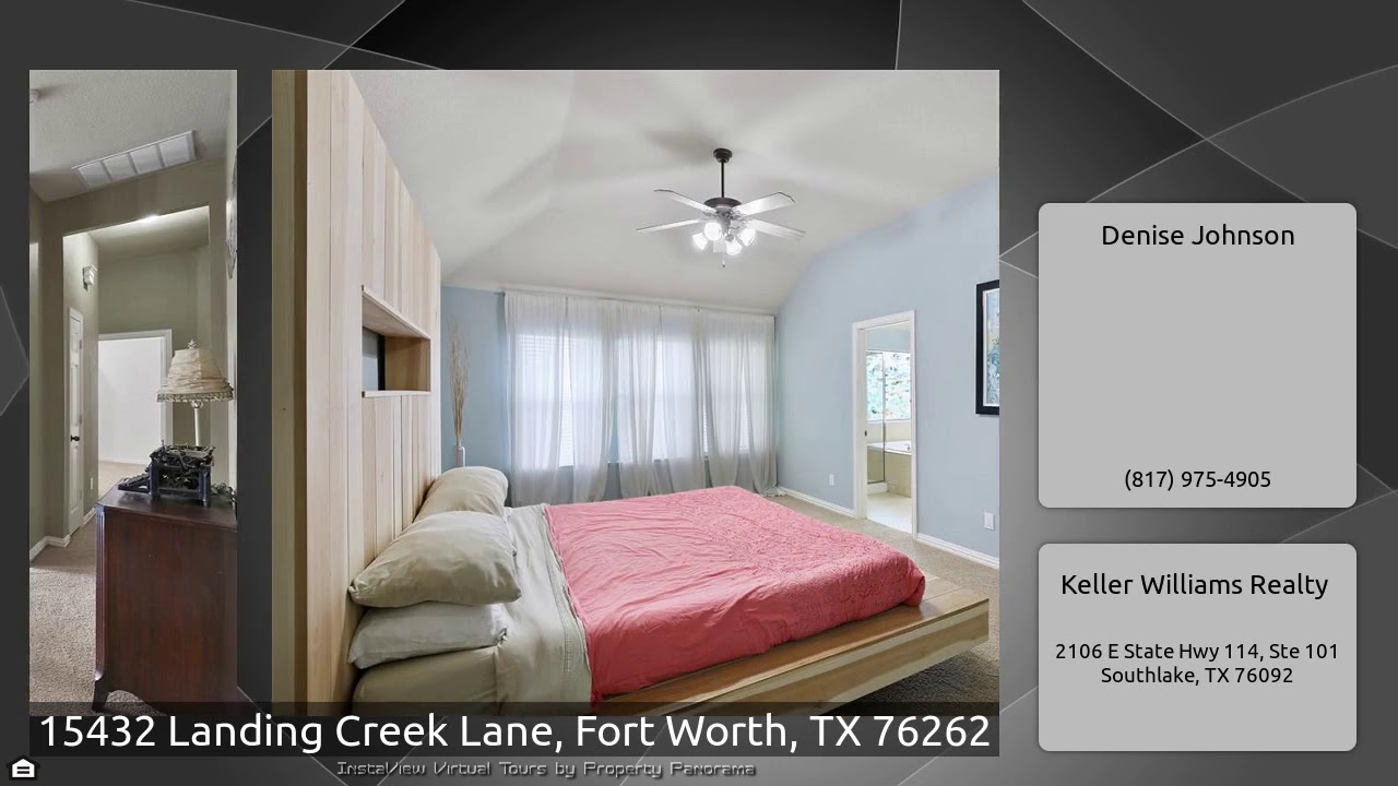 The Virtual Tour for the property at 15432 Landing Creek Lane, Fort Worth, TX 76262 listed for $315,000: Other homes for sale by Denise Johnson of Keller Williams Realty: VIRTUAL OPEN HOUSE APRIL 12TH 2-4PM!! One story, 4 BR home in Chadwick Farms community available now! This home is extremely spacious w tons of storage & walk-in closets in every bedroom! Beautiful entry greets you w french doors that open to a study (perfect for home office or playroom) and formal dining room on opposite side. Open-concept main living room w fp, granite-covered kitchen w ss appliances and both, breakfast …