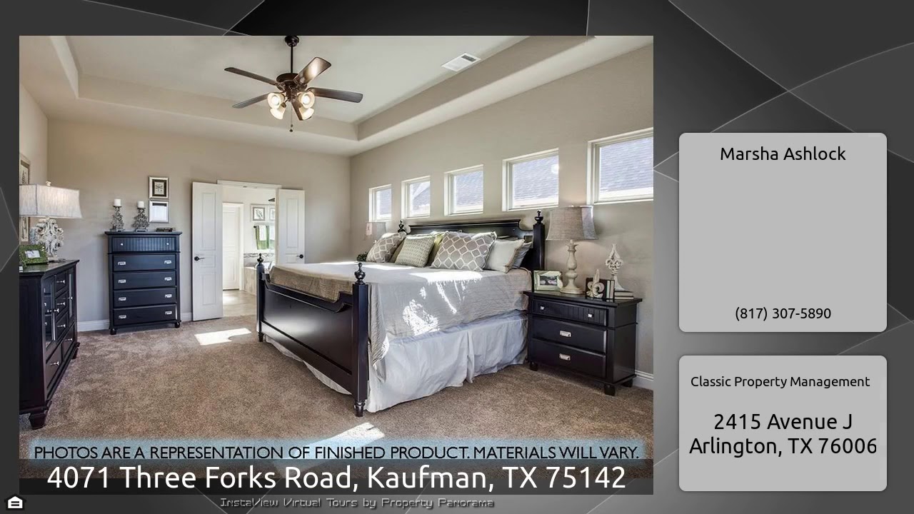 The Virtual Tour for the property at 4071 Three Forks Road, Kaufman, TX 75142 listed for $324,975: Other homes for sale by Marsha Ashlock of Classic Property Management: Beautiful NEW BLOOMFIELD HOME ready NOW! This 4BR, 3.1 BA home is situated on a Corner Lot; Porcelain Wood-look Tiles throughout Main Areas. Open Kitchen with granite counters, walk in pantry and island; Master Suite with walk-in closet, dual sinks, garden tub; separate shower; Study with French Doors; Upstairs Game Room; 2nd Master Suite on 2nd floor; Extended Covered back patio; Cedar Garage Door; FULLY LANDSCAPED. Call …