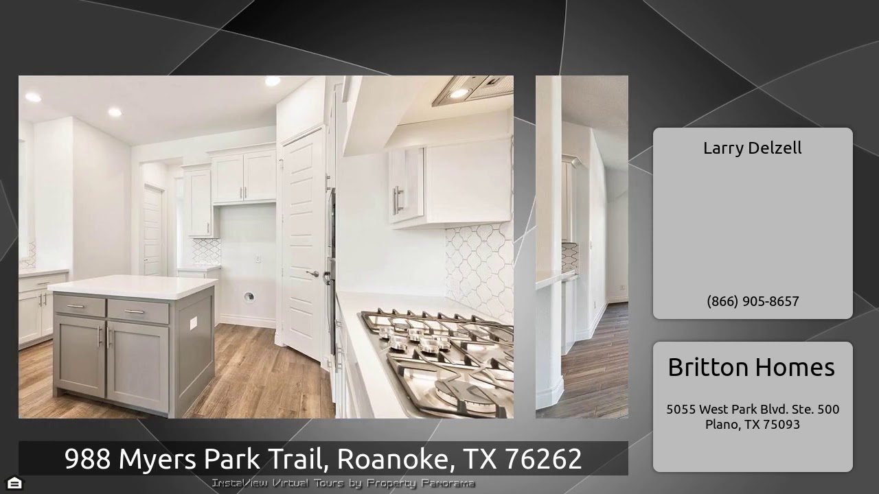 The Virtual Tour for the property at 988 Myers Park Trail, Roanoke, TX 76262 listed for $549,900: Other homes for sale by Larry Delzell of Britton Homes: PERRY HOMES NEW CONSTRUCTION READY FOR MOVE-IN! Formal Dining Room and Library with French doors frame the entry with 12-foot coffered ceiling. Large kitchen features abundant counter top space, gas cooktop, large island, built in seating that opens to family room. Morning area and game room with French door entry. Spacious master suite with dual sinks, garden tub, separate glass-enclosed shower and walk-in closet in the master bath. …