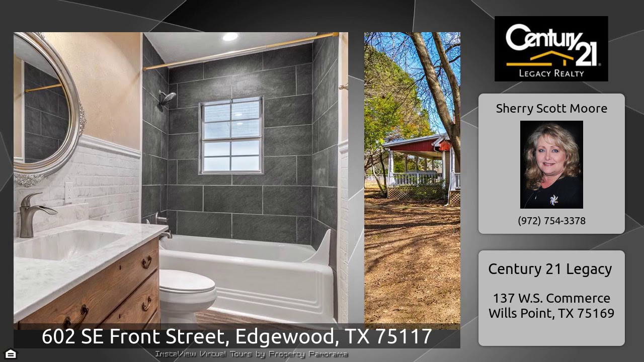 The Virtual Tour for the property at 602 SE Front Street, Edgewood, TX 75117 listed for $179,900: Other homes for sale by Sherry Scott Moore of Century 21 Legacy: Gingerbread trim & porches all around!Yesteryear charm abounds in this spacious 3 bdr, 2 bath vintage frame home on almost an acre!Modern coveniences in a historic setting! Moved to its present location in the early 1990's, is beautifully restored & move in ready! Hardwood flooring, central heat & air.Formal living room has WBFP with unique circular accent window! Formal dining with french door,kitchen with eating bar and …