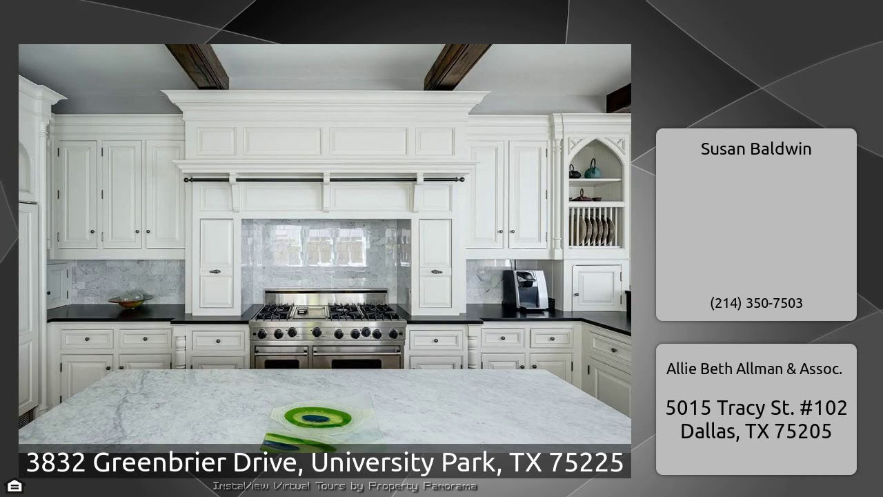 The Virtual Tour for the property at 3832 Greenbrier Drive, University Park, TX 75225 listed for $2,995,000: Other homes for sale by Susan Baldwin of Allie Beth Allman & Assoc.: Built with the highest quality & attention to every detail, this custom home was designed and built by noted architect Larry Boerder. The layout offers great flow and ample light with spacious formals, second living with oversized fireplace, open to the covered patio & pool, eat-in kitchen with butlers pantry, and gorgeous study. Basement includes chilled wine storage and versatile room with French brick flooring …