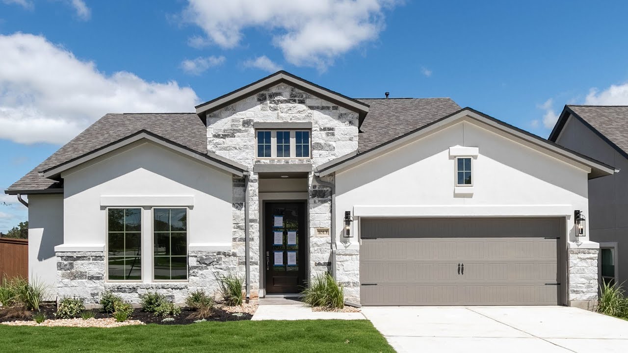 Take a look at Bryson homes in Leander, located just west of Georgetown and northwest of Round Rock near Austin. This 2738 sq. ft. home has four bedrooms and three full bathrooms. Corner homesite. Library with French doors and designer tile floor set at spacious entry. Game room with French doors off extended entry. Family room with designer tile floor and wall of windows opens to kitchen and dining area. Kitchen features corner walk-in pantry and inviting island with built-in seating space. Master suite includes bedroom with wall of windows. Dual vanities, corner garden tub, separate glass-enclosed shower in master bath. Guest suite offers private bath. High ceilings and large windows add to this generous four-bedroom home. Extended covered backyard patio. Two-car garage. #perryhomes #perryhomesaustin #bryson