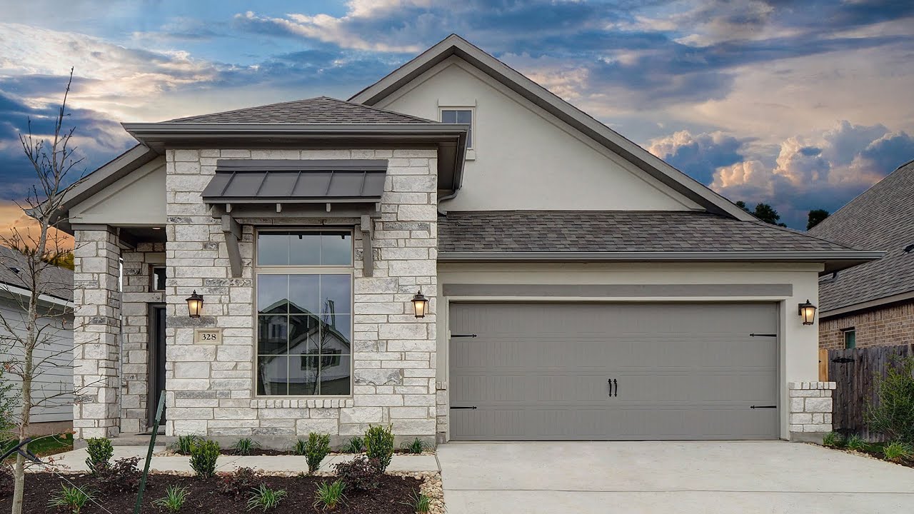 Welcome to the beautiful community of Blanco Vista located in San Marcos, Texas. This 1800 sq. ft. home has three bedrooms and two full bathrooms. Entry with 12-foot ceiling leads past library with glass French doors to open family room, kitchen and dining area. Wood-look tile floors and walls of windows throughout. Kitchen offers corner walk-in pantry and inviting island with built-in seating space. Spacious master suite includes double-door entry to master bath with dual vanities, corner garden tub, separate glass-enclosed shower and large walk-in closet. Secondary bedrooms feature walk-in closets. Extended covered backyard patio. Mud room off two-car garage. #perryhomes #perryhomesaustin #blancovista