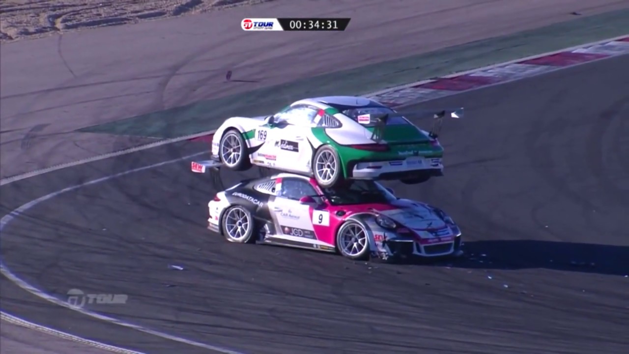 Après un départ fougueux de quelques concurrents lors de la course 2 de la Porsche Carrera Cup France 2015 sur le Circuit de Navarra, Jules Gounon se retrouve littéralement projeté sur le toit de la voiture de Joffrey De Narda .