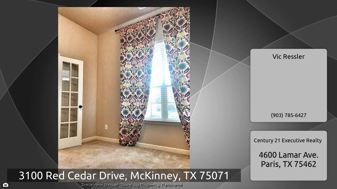 The Virtual Tour for the property at 3100 Red Cedar Drive, McKinney, TX 75071 listed for $299,000: Other homes for sale by Vic Ressler of Century 21 Executive Realty: This LEED Certified energy efficient 3 bedroom 2 bath 2 car garage home in Mckinney is in the highly desired Prosper ISD school district. Three bedrooms, two full baths, breakfast area, eat at bar, media room wired for sound, study-office with French doors could also be formal dining room, planning desk area with space for computer, keyboard and printer, Nest thermostat, all in northern Collin County location.