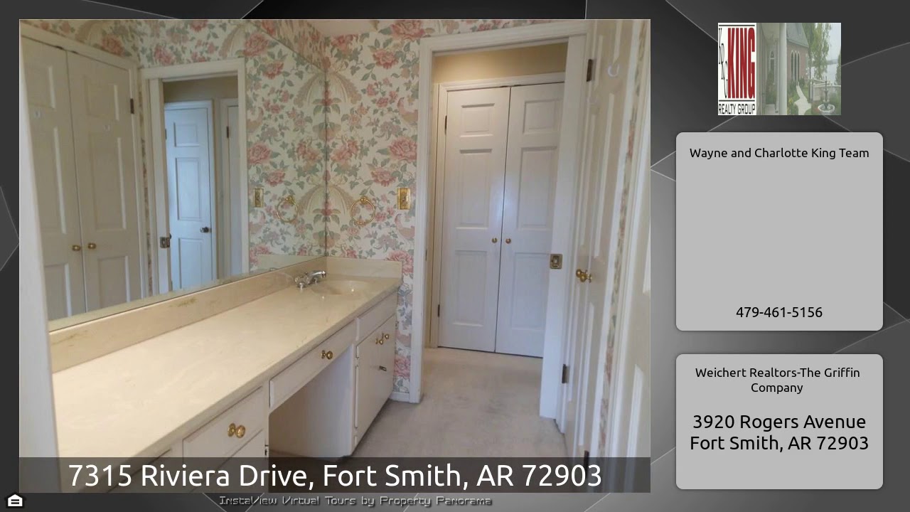 The Virtual Tour for the property at 7315 Riviera Drive, Fort Smith, AR 72903 listed for $239,900: Other homes for sale by Wayne and Charlotte King Team of Weichert Realtors-The Griffin Company: Just Reduced! Great buy, great location, great house!!Custom built brick home on double lot features large formal living/dining just off the kitchen, large family room with fireplace and built-in book cases. French doors open out to the brick patio. Master on main floor level features small office adjoining, three bedrooms & 2 baths upstairs. Bonus room could be a game room, living room or …