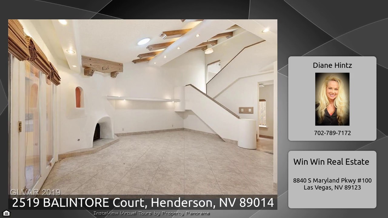 The Virtual Tour for the property at 2519 BALINTORE Court, Henderson, NV 89014 listed for $239,000: Other homes for sale by Diane Hintz of Win Win Real Estate: LARGE Green Valley Townhome with CUSTOM decor. OPEN layout with beautiful vaulted WOOD BEAMED ceilings and natural wood accents everywhere. TWO FIREPLACES, family room & master. All of upstairs is the spacious Master suite. Other bed & den down. Den can be used as 3rd bedroom. ATRIUM, SKY LIGHTS & built-in WINE CELLAR. Full length French doors open to wonderful COVERED PATIO with BarbQ. $2000 towards closing costs w/ full price offer!