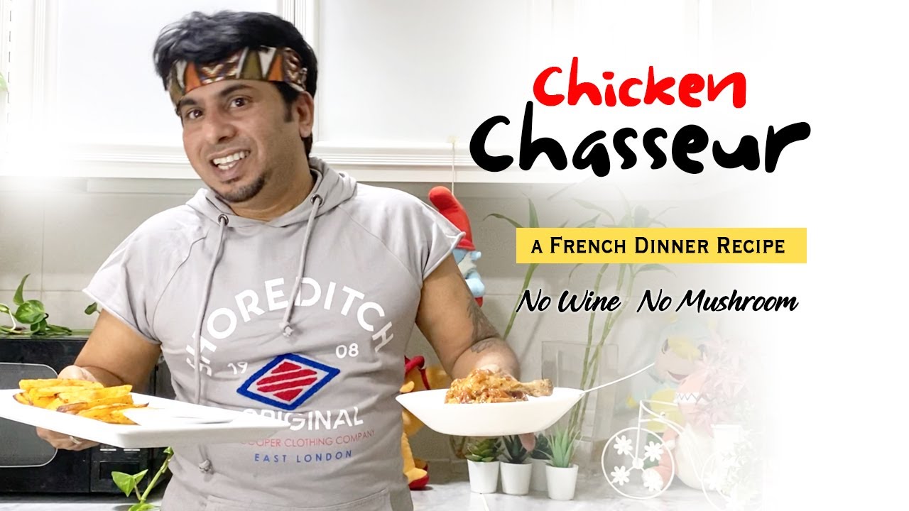Chicken Chasseur with Potato Wedges and Pasta as a French Dinner, Also known as Hunters Chicken.with out wine and mushrooms.