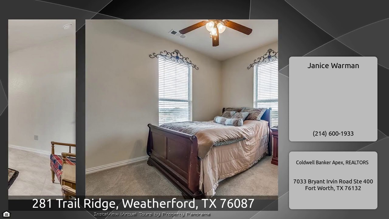 The Virtual Tour for the property at 281 Trail Ridge, Weatherford, TX 76087 listed for $449,999: Other homes for sale by Janice Warman of Coldwell Banker Apex, REALTORS: PRICE REDUCTION. Beautiful family home with 6 bedrooms and 4.1 bathrooms. The curb appeal will take your breath away. You are greeted with a front porch to take in the panoramic views. The soaring ceiling inside await you as you enter the home with a study with french doors and a dining room. The family room is open to the spacious custom kitchen with breakfast bar, granite counters, & walk in pantry. The laundry room with …