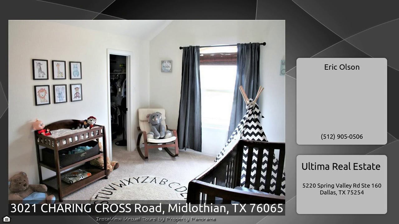 The Virtual Tour for the property at 3021 CHARING CROSS Road, Midlothian, TX 76065 listed for $394,900: Other homes for sale by Eric Olson of Ultima Real Estate: HUGE YARD!!! This Home is almost new an includes lots of added features expected on more expensive CUSTOM homes. From the SAVANT SMART HOME System, Double Oven, an Tankless Water Heater to the Movie Room an Butlers Pantry you won't want for more. A Dramatic Curved Staircase with Wood Railing an a Princess Overlook adornes the living room. You'll find both master and home office with French Doors an closet on the first floor. …