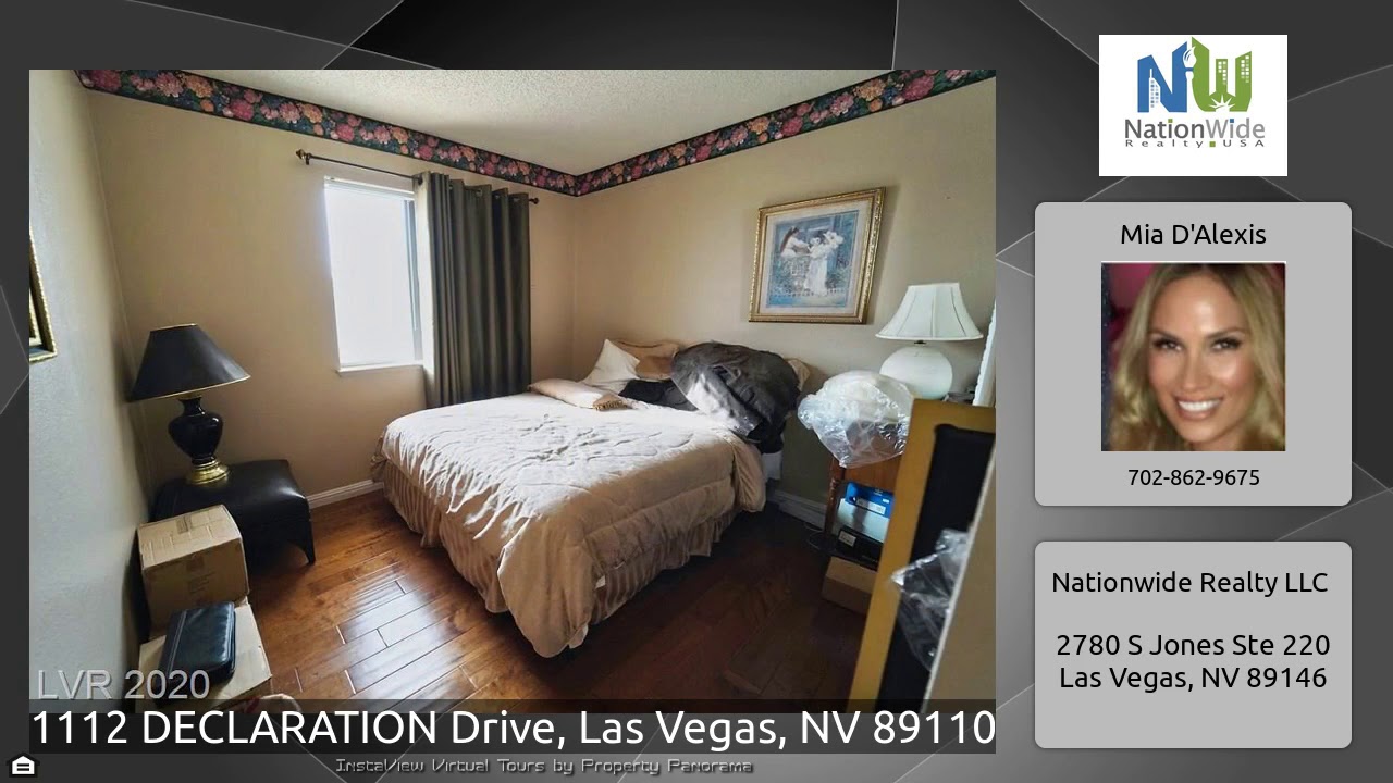 The Virtual Tour for the property at 1112 DECLARATION Drive, Las Vegas, NV 89110 listed for $235,000: Other homes for sale by Mia D'Alexis of Nationwide Realty LLC: * HUGE LOT SIZE* 1 story 4 BR*2 Bath*2 car garage w/side driveway for 2 add’l cars * Over sized private backyard w/covered patio great for entertaining guest!! Laminate wood and tile flooring, large living room w/fire place and vaulted ceiling & French door to backyard! Master w/bath & 2 walk-in closets!!!*Just within minutes to shopping, dining and entertainment! Schools and parks are within walking distance!