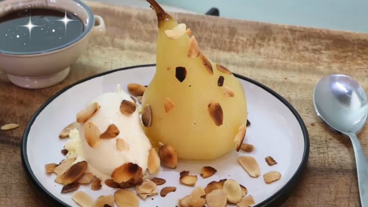 Poached Pears recipe with chocolate sauce vanilla ice cream and roasted almond. this step by step video will show how to make that delicious poached pears dessert from scratch.