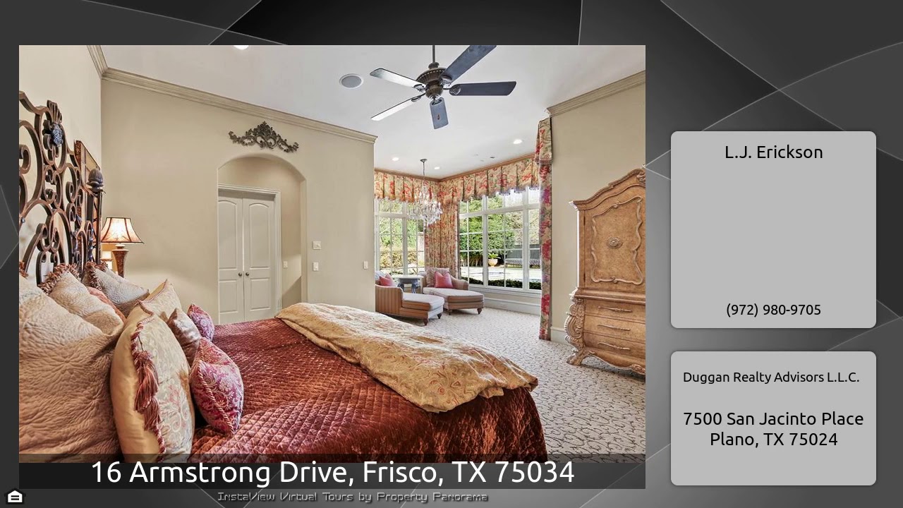 The Virtual Tour for the property at 16 Armstrong Drive, Frisco, TX 75034 listed for $1,800,000: Other homes for sale by L.J. Erickson of Duggan Realty Advisors L.L.C.: Hawkins Welwood Country French masterpiece located in the Villages of Stonebriar park, Frisco's premier gated -guarded community. Incredible one-owner estate home situated on nearly half acre cul de sac lot. All Viking appliances. Salt water pool with in floor cleaning system. Hand painted wall and ceiling murals. 400 bottle wine grotto. Two verandas with outdoor Viking pro grill. Fully equipped media room. Three oversized …