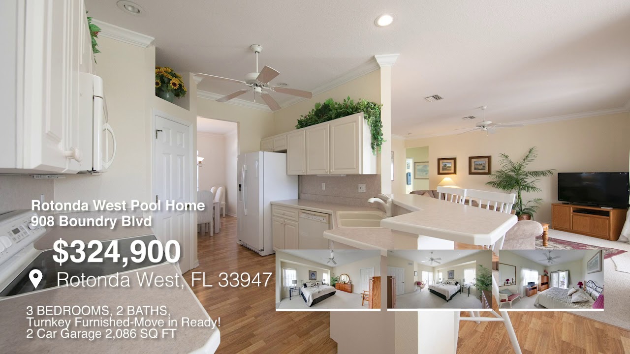 Looking for a spacious home with a pool on an extra large lot with canal frontage? This turnkey furnished Rotonda West home in the quiet section of White Marsh offers 2,086 sqft of comfort and features 3 bedrooms plus a den, 2 bathrooms, and a two-car garage. You enter the home through double doors into the family room with beautiful views of the heated pool and canal beyond. The large split master ensures privacy and includes an en suite bathroom, walk-in closets, and direct access to the pool through French doors. The kitchen has its own dining space with aquarium glass windows so you can enjoy sunsets overlooking the pool and canal.